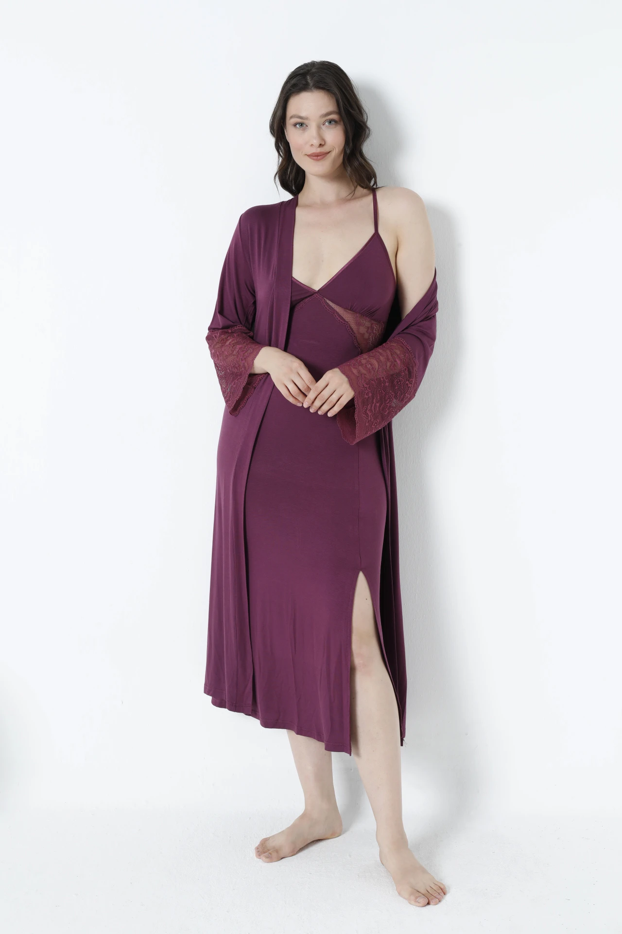 KADIN İP ASKILI GECELİK SABAHLIK TAKIM C840-445, viskon kumaşı ile terlemeyi önleyen ve cildinize nazikçe dokunan gecelik modelimizdir. Tüm gece boyunca rahat bir uyku sağlar. Çevre dostu ve sürdürülebilir özelliklere sahip olup, her yaş grubuna hitap eder.