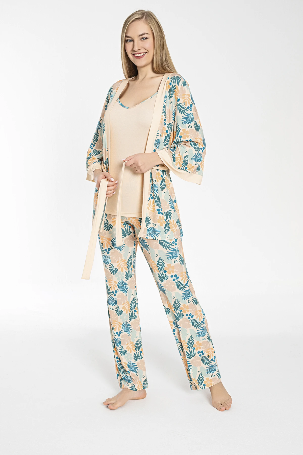 Kadın 3'lü İp Askılı Sabahlıklı Pijama Takımı C840-419