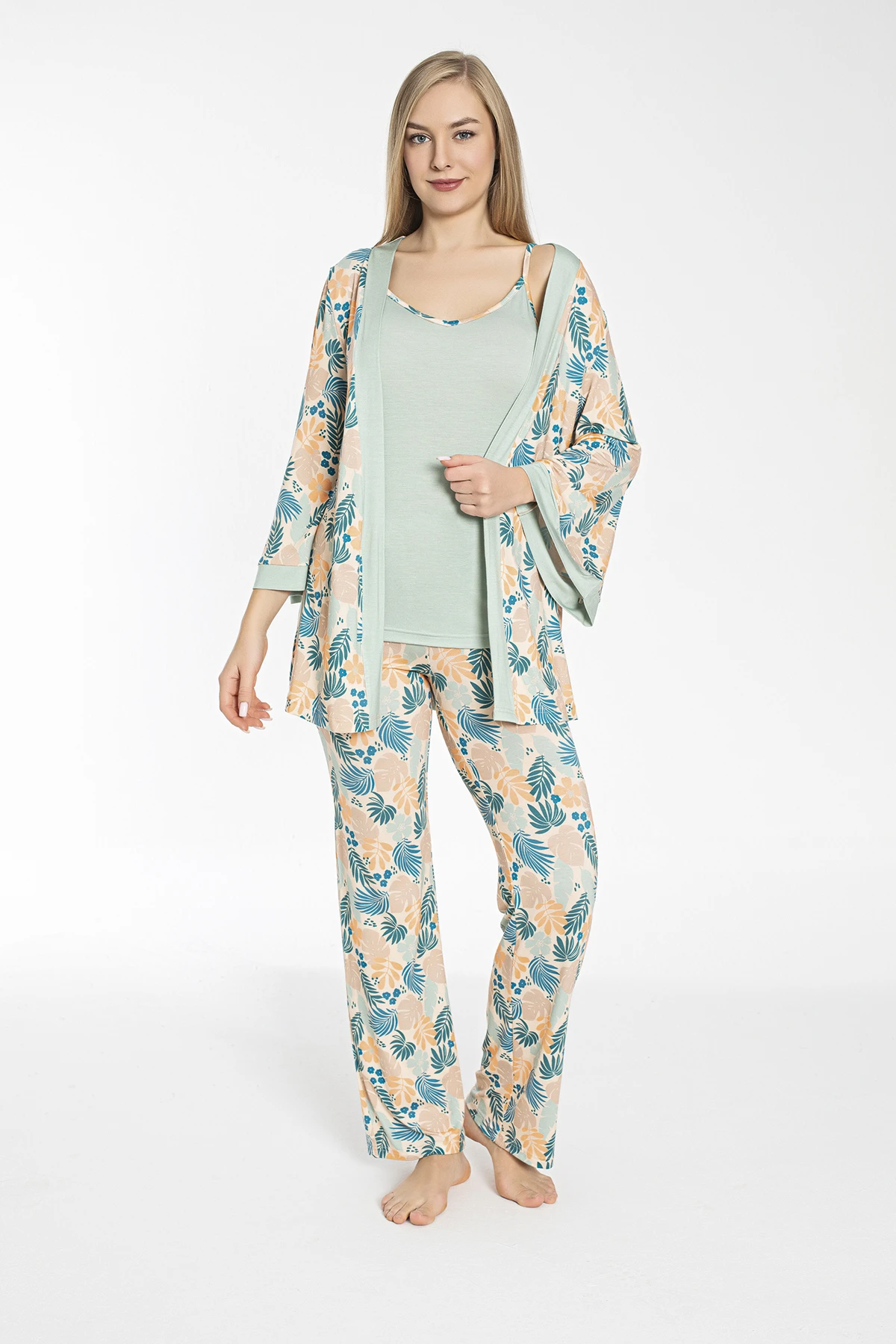 KADIN 3'LÜ SET SABAHLIKLI İP ASKILI PİJAMA TAKIM C840-419, zarif tasarımıyla öne çıkan pijama takımımızdır. Yumuşak viskon kumaşı sayesinde cildinizle uyum sağlar ve konforlu bir uyku deneyimi sunar. Sağlığa zararsız materyallerden üretilmiş olup, birçok renk ve model seçeneğiyle ev giyimde ideal tercihiniz olacaktır.